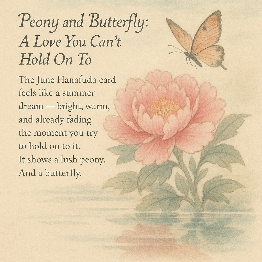 The June Hanafuda card feels like a summer dream — bright, warm, and already fading the moment you try to hold on to it. It shows a lush peony. And a butterfly. No borders. No symmetry. Just blooming — and something touching it for a moment.